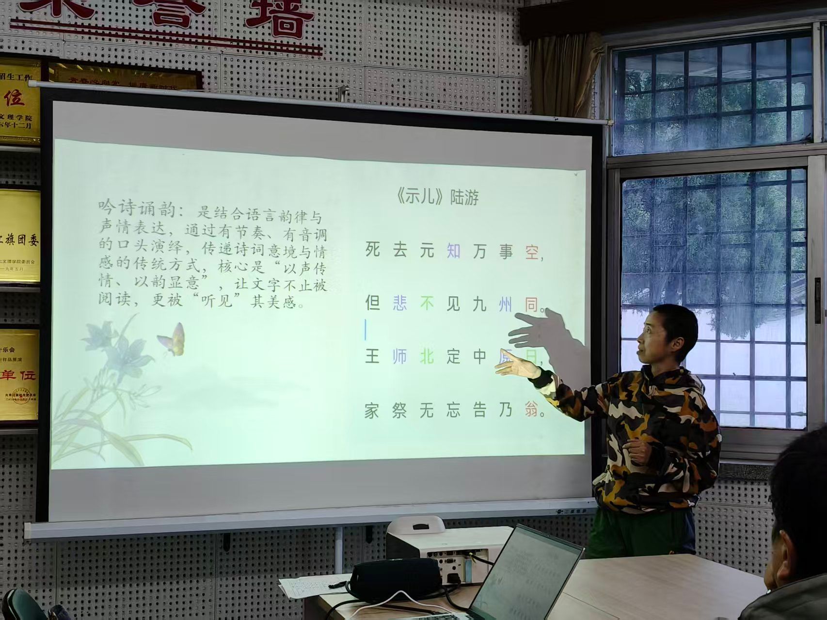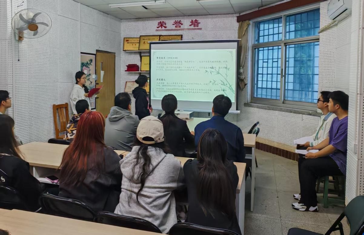 随后,胡水欣副教授以著名诗人陆游所做,蕴含家国情怀的《示儿》为切入点,解析诗词的创作背景与韵律结构,搭建起历史与诗乐的情感联结,讲述了家国情怀不仅贯穿了陆游60余载的创作历程,而且几乎融入他的全部生命。通过王翰的《凉州词》,指导同学们自主创作吟诵调。1分钟创作实践后,多位同学上台分享作品,胡水欣副教授从历史情感传递与诗乐韵律结合角度进行点评,助力同学们以创作铭记历史。