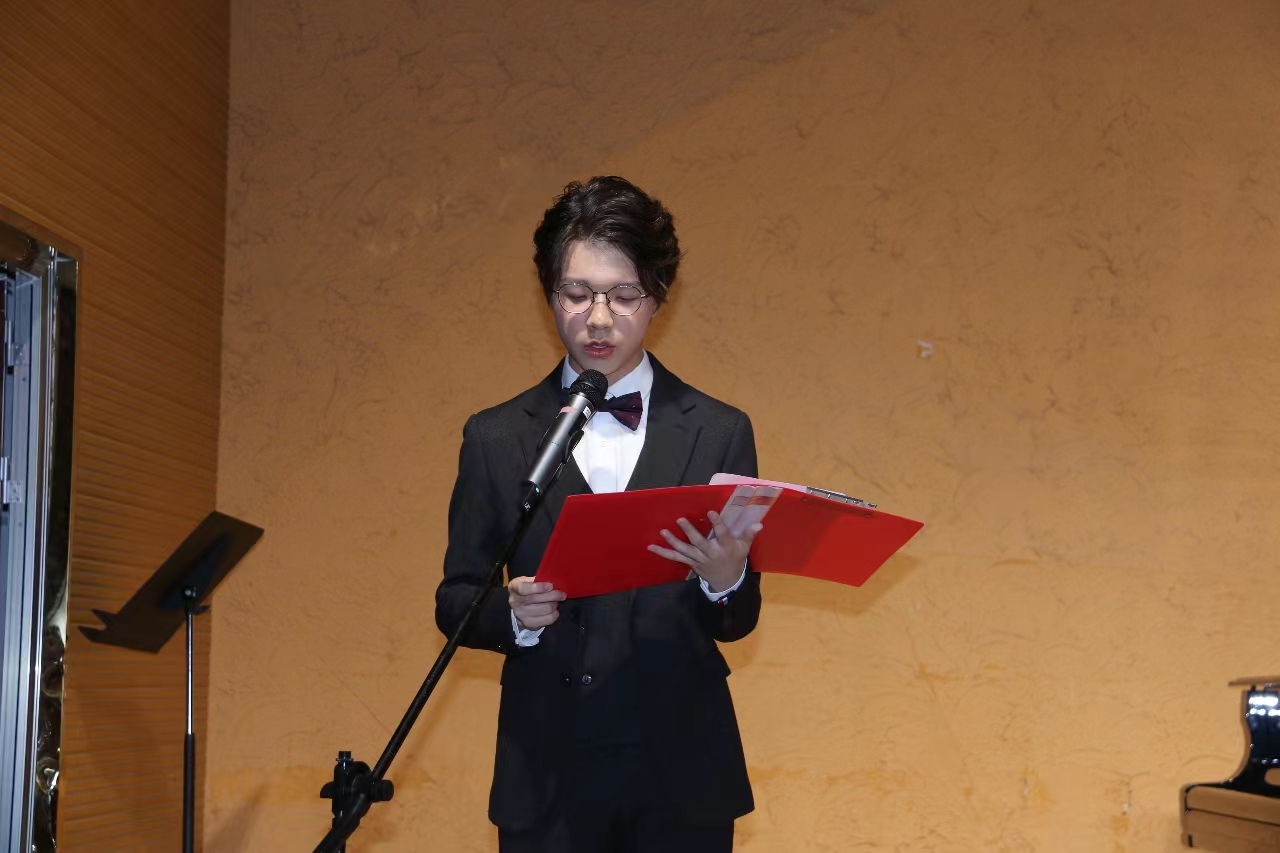 图为新生代表,音乐学2313班冯骁骏发言