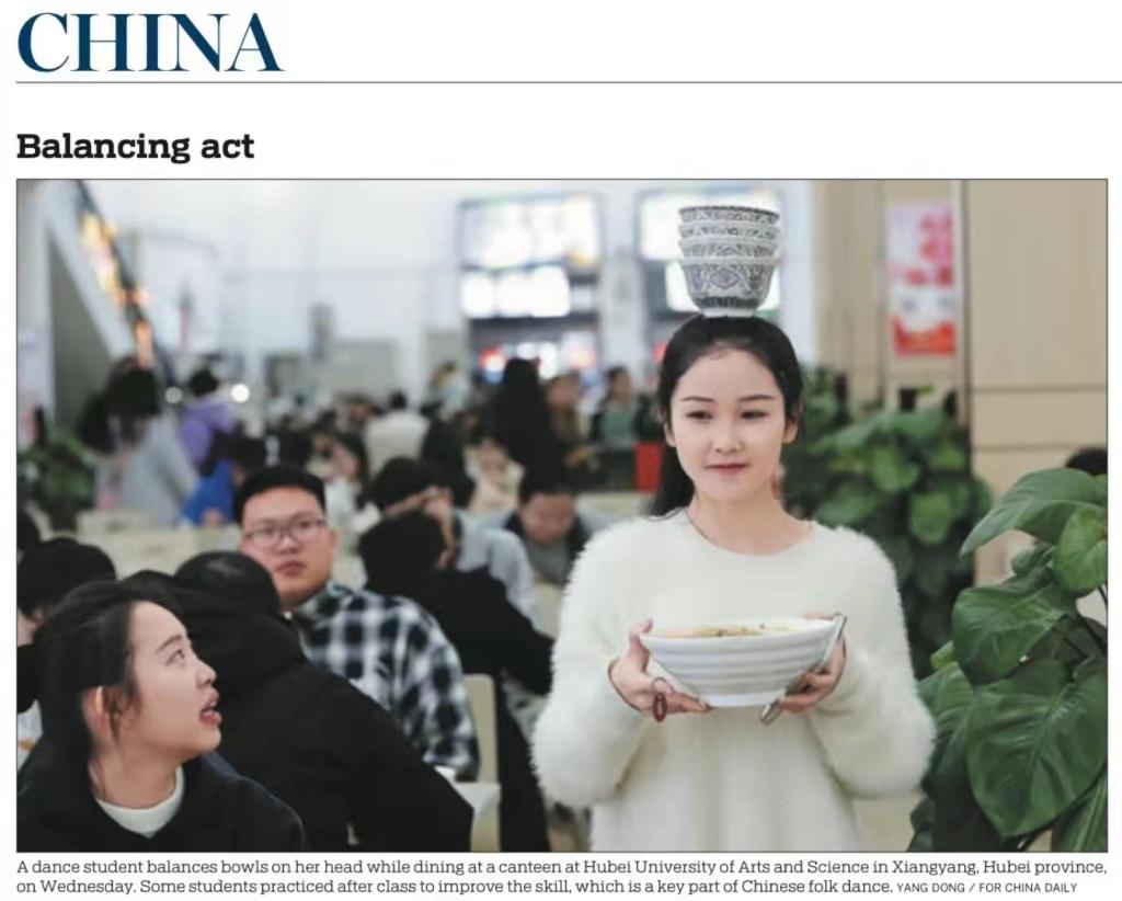 在湖北省襄阳市williamhill英国中文,一名舞蹈系学生在食堂就餐时将碗顶在头上练习平衡。许多舞蹈生常在课后练习,以提升平衡能力,这是中国民族舞蹈的重要技巧。杨东/《中国日报》报道
