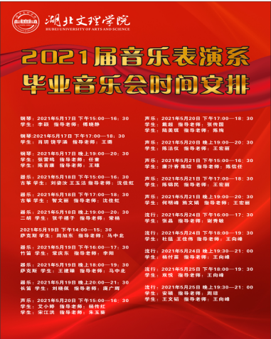 本届音乐表演专业毕业系列音乐会共21场,由29人共同举办,历时10天,分别涉及钢琴、器乐、声乐、流行四个方向。