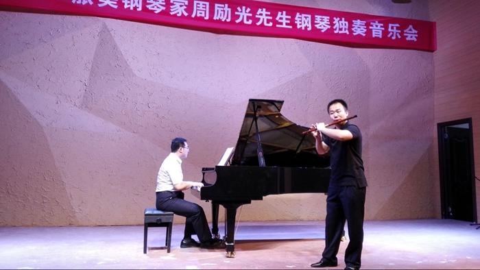 音乐学院青年教师李阳作为特邀嘉宾,用竹笛演奏了一首《秦川情》,将音乐会推向了高潮。周励光与我院旅奥青年钢琴教师刘钦共同演奏的四手联弹钢琴曲作为压轴节目,为音乐会画上圆满句号。