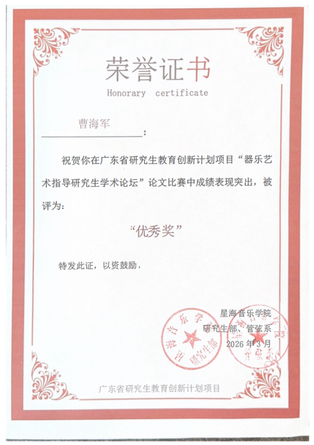 2026年3月27日,广东省研究生教育创新计划项目——“器乐艺术指导研究生学术论坛”在广州圆满落下帷幕。作为论坛的重要组成部分,论文比赛也同期顺利结束。本次比赛由星海音乐学院研究生部、艺术实践服务中心、管弦系联合主办。williamhill英国中文音乐与舞蹈学院 声乐老师曹海军代表学院参加本次论文评选,在全国范围内多所院校师生的激烈竞争下。经专家盲审初评、复评,依据原创性、学术性、实践性等标准严格遴选,最终曹海军老师荣获优秀奖。