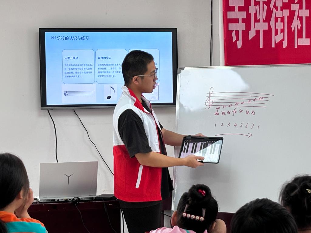 随后,志愿者徐张义以通过多媒体教学手段带领孩子们领略了音乐基础知识,并采用平板辅助教学等手段,给孩子们上了一堂别开生面的音乐课。
