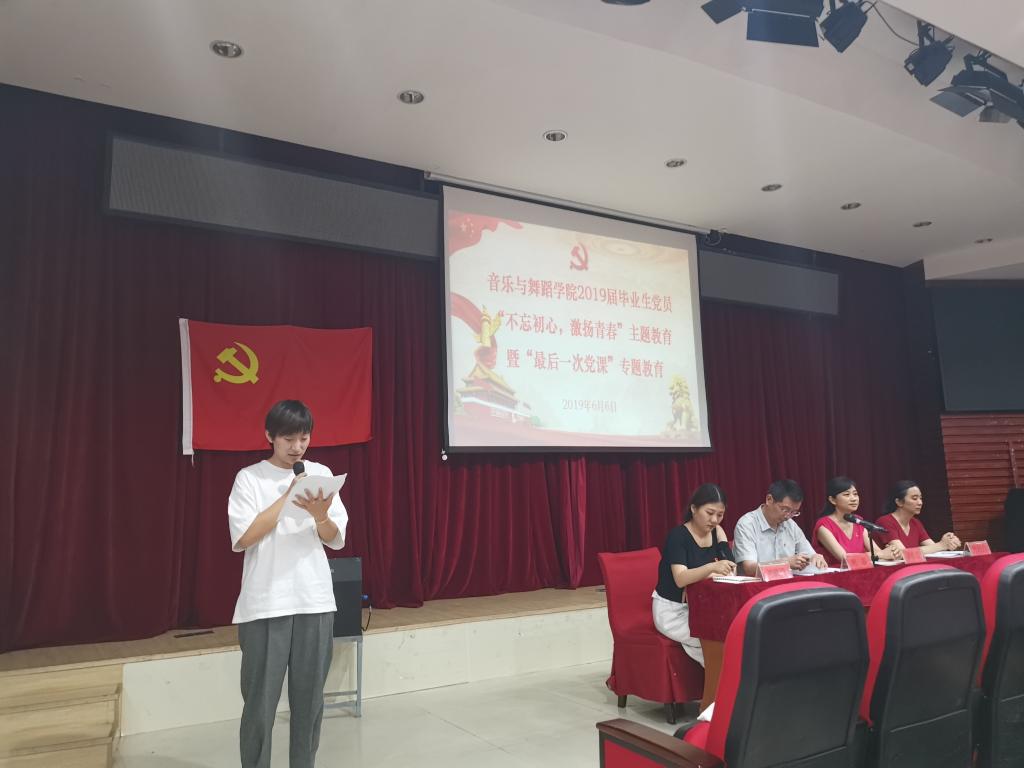党课现场播放了近两年党员各项活动照片组成的视频,从党旗在心中飘扬、在校园飘扬、在社区飘扬三个方面展现党员风采;音乐学支部毕业生党员何郑青带领全体人员向党旗庄严宣誓,重温入党誓词;音乐学支部毕业生党员纪官升、音乐表演与舞蹈表演支部毕业生党员刘沛发言,他们表示将不忘初心,在新的岗位上继续发挥党员的先锋模范作用。