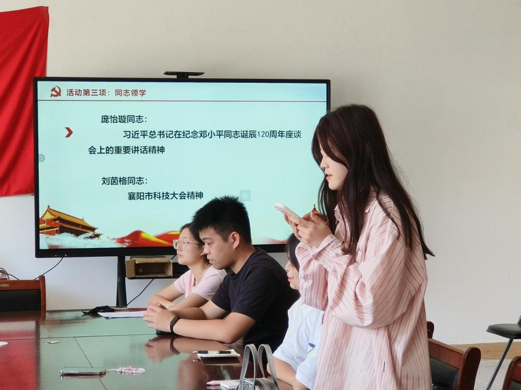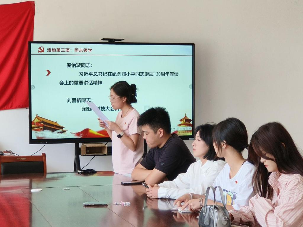 随后,由庞怡璇同志和刘茵格同志分别领学习近平总书记在纪念邓小平同志诞辰120周年座谈会上的重要讲话精神和襄阳市科技大会精神。