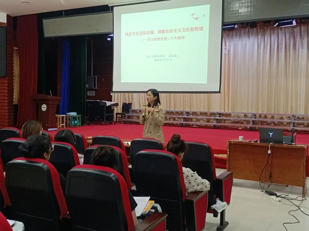 她着重讲述了新时代全面建设社会主义现代化国家,必须坚持中国特色社会主义文化发展道路,要着力从五个方面:通过建设具有强大凝聚力和引领力的社会主义意识形态,广泛践行社会主义核心价值观,提高全社会文明程度,繁荣发展文化事业和文化产业,增强中华文明传播力影响力,推进文化自信自强,铸就社会主义文化新辉煌。她号召同学们,在学校勤奋学习,苦练本领,主动肩负起国家文化建设中文艺工作者重任。