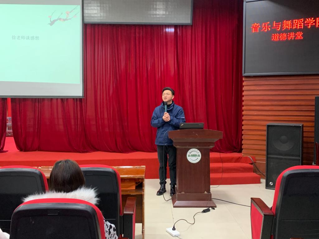 本期道德讲堂主讲人为学校第四批“格桑花”支教团队队长、音乐舞蹈学院学工办主任徐小浩老师。活动分向“德”鞠躬、开场三问、唱歌曲、诵经典、学模范、发善心、送吉祥、做善事等八个环节。