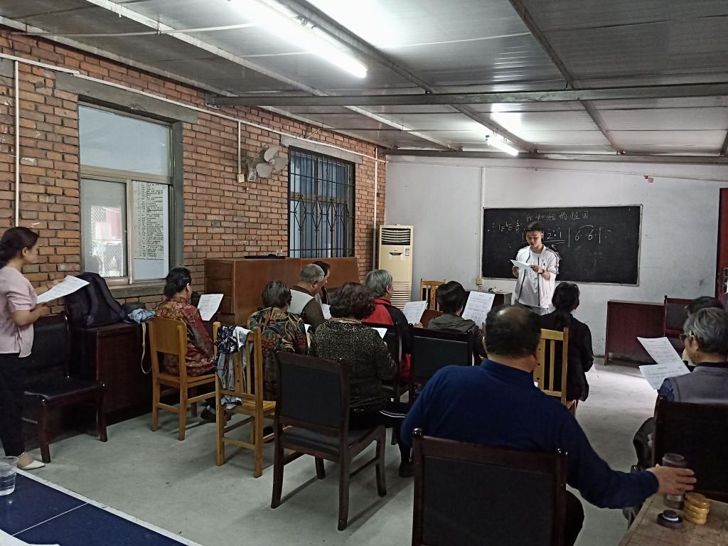 志愿者带领离退休教职工练习了歌曲《我和我的祖国》,从节奏、歌谱、朗诵歌词、教唱等方面开展教学,认真、细致地引导老同志熟悉歌曲,掌握演唱方法和技巧。教学活动持续了一个多小时,志愿者们用他们的认真、负责、热情、细心赢得了老教师们一致赞扬。为了今后更好的开展教学活动,返校后志愿者们一同探讨分析教学中遇到的问题,并提出可行性的改进意见。