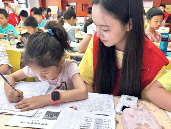 随后,志愿者们给孩子们分组,并且选出了小组长。在趣味游戏环节,萝卜蹲、击鼓传花、反向口令等游戏一个接一个地进行,孩子们都积极参与,现场充满了欢声笑语。活动的最后,志愿者们变成了 “学习小导师”,认真地辅导孩子们完成作业,耐心地讲解每一道难题。