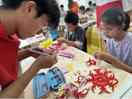 课堂上,志愿者们巧妙地将红色教育与非遗传承自然融合。当有孩子好奇地问及“建党是什么”时,志愿者以剪纸五角星作比:“就像五颗星紧紧相连,百年前的先辈们团结奋斗,才换来今天的幸福生活。”生动的比喻让孩子们更易理解红色历史,也让剪纸艺术在传承文化的同时,赋予了更深刻的思想内涵。