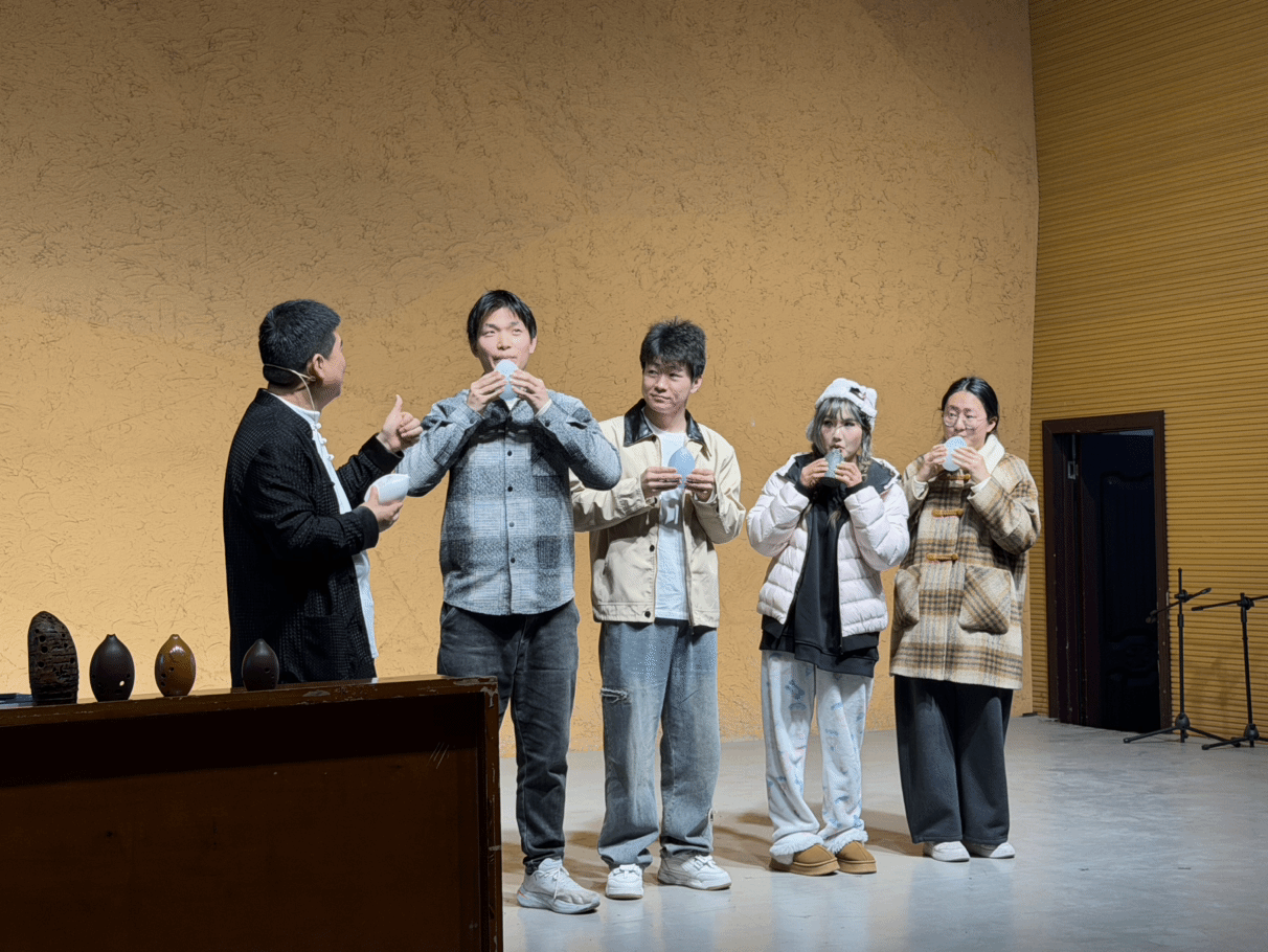 为了让师生更直观地感受古埙的发声原理,讲座特设互动体验环节。现场同学们纷纷上台试吹,在老师的耐心指导和调整下,同学们也成功吹出了古埙的音调。这一环节不仅拉近了观众与非遗艺术的距离,更让大家在亲身体验古老乐器的过程中,体会到了传统音乐的独特魅力。