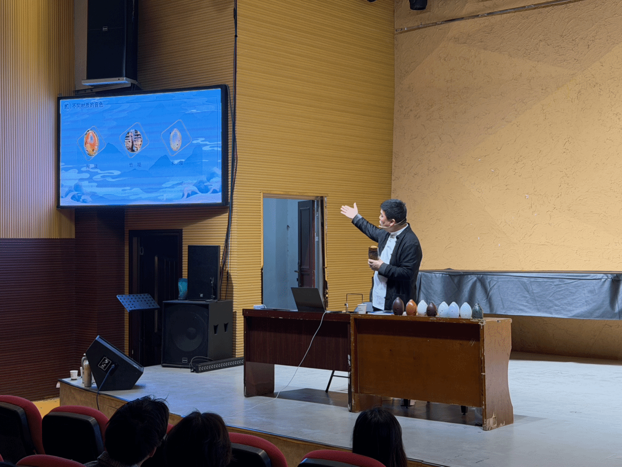 李玉亭老师是中国音乐家协会会员、洛阳市音乐家协会副主席、洛阳市青年音乐家协会主席,同时也是洛阳歌舞剧院音乐制作人、录音师、洛阳电视台历届春节晚会的音乐制作人,非物质文化遗产传承人,并于2025年10月出版国内首部原创埙曲集《埙韵长河》。在本次讲座中,他围绕古埙的历史渊源、艺术特色、传承发展等方面展开了深入的讲解,以丰富的内容与专业的演奏示范,带领师生们穿越千年时光,感受古埙独有的醇厚音色与东方美学。他先后倾情演奏了《离歌》《女儿情》《埙你好》等经典曲目,并现场演绎了专为襄阳创作的原创作品《汉江月》,用悠悠埙声诉说汉江文脉与古城情怀。从古埙演奏的精湛技艺,到非遗文化的使命传承,李玉亭老师的分享让在场师生对这一古老乐器有了全新的、全方位的认知与理解。