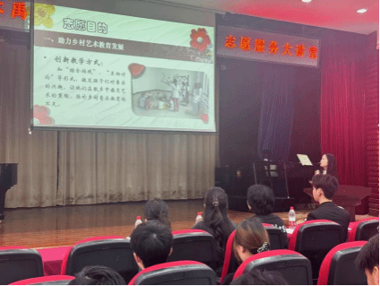 我院“音为爱”本禹志愿服务代表罗之桂上台分享经验。团队成立于2018年,旨在改善乡村艺术教育、关爱留守儿童。他们规范管理,精准对接乡村小学需求,创新教学模式,成果显著。已开展200余次活动,服务超800名留守儿童,在教育、文化传承等领域成绩突出,并获得多项荣誉。