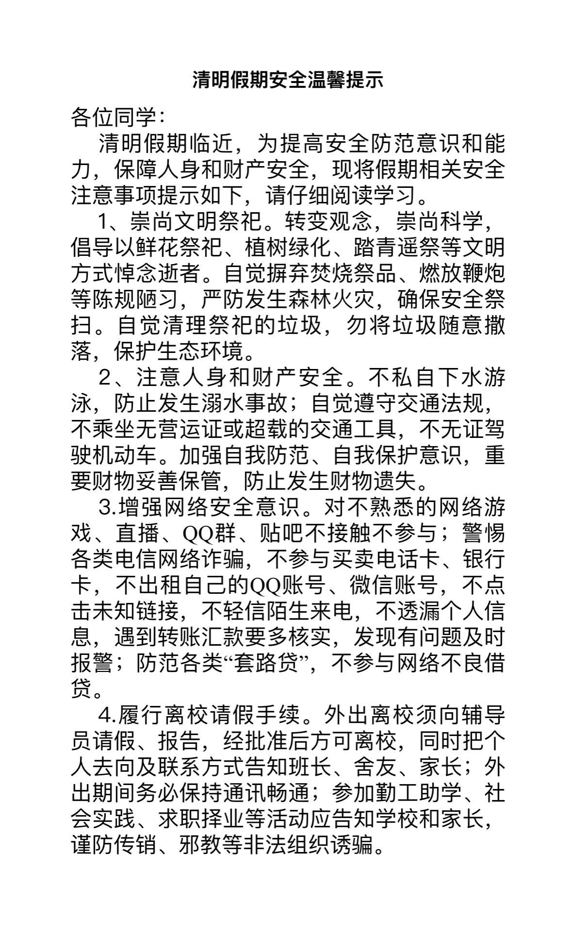 (通讯员:张博谦)清明假期临近,为提高安全防范意识和能力,保障人身和财产安全,williamhill英国各班召开清明节前安全教育主题班会。