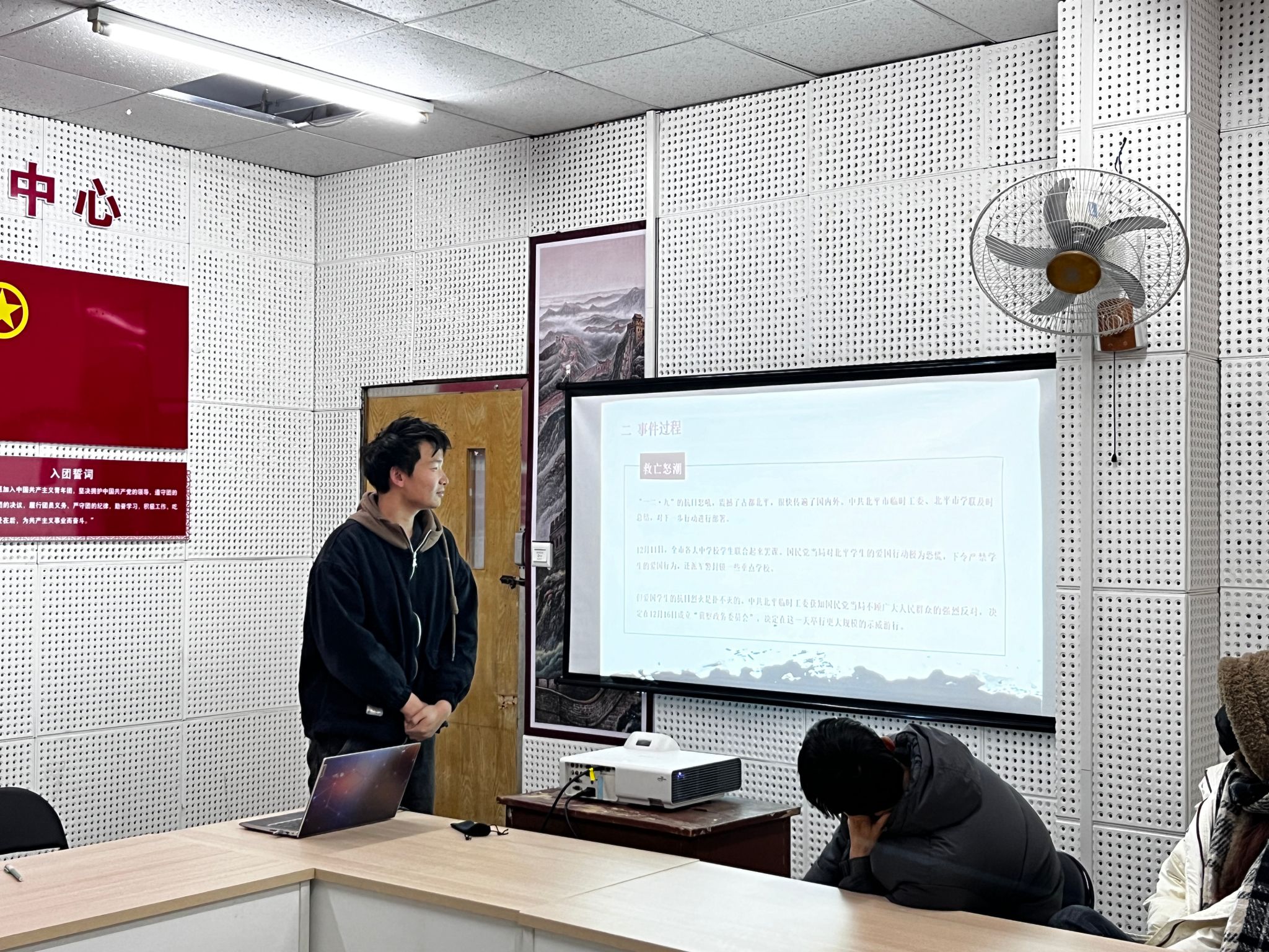活动伊始,张博谦以生动的讲述将同学们带回到了 1935 年那个动荡不安却又热血激昂的年代。他详细介绍了一二・九运动爆发的背景、过程和深远影响,通过一幅幅珍贵的历史图片、一段段感人至深的史实故事,让同学们仿佛亲眼目睹了当年青年学生们为了反对华北自治,反抗日本帝国主义,挽救民族危亡而进行的英勇斗争。同学们沉浸其中,深刻感受到了先辈们坚定的爱国信念和无畏的牺牲精神,对一二・九运动的伟大意义有了更为直观和深刻的认识。
