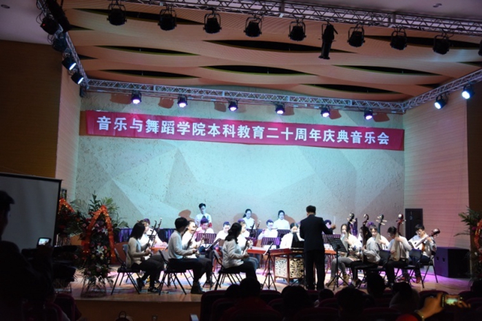 音乐会于晚上六时三十分准时开始。曾在湖北省大学生艺术节上获一等奖的民乐团演奏的民族器乐合奏《花好月圆》拉开了音乐会的帷幕;校友郜灿、张国平、冯金刚、孔季红与曾经的授业恩师一起合作了《感恩》、《人间第一情》、《我爱你中国》等经典曲目,道不尽对母校的深情厚谊,唱出了人间真情美好希望,表达了对母校无尽的爱与期盼。
