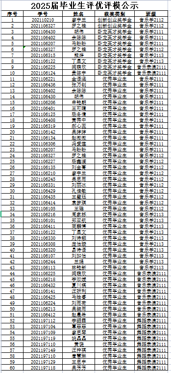 根据学校《关于做好2025届本科毕业生评优评模工作的通知》(学工字〔2025〕18号)有关文件精神,经学生本人申请,学院评定小组研究,拟推荐如下同学作为2025届本科毕业生评优评模人选(推荐人员具体情况见附件),现予以公示,公示期为5日,从2025年5月6日——5月10日。公示期内如有异议,可以电话或书面形式进行反映。如有疑议请在公示期内如实反映。
